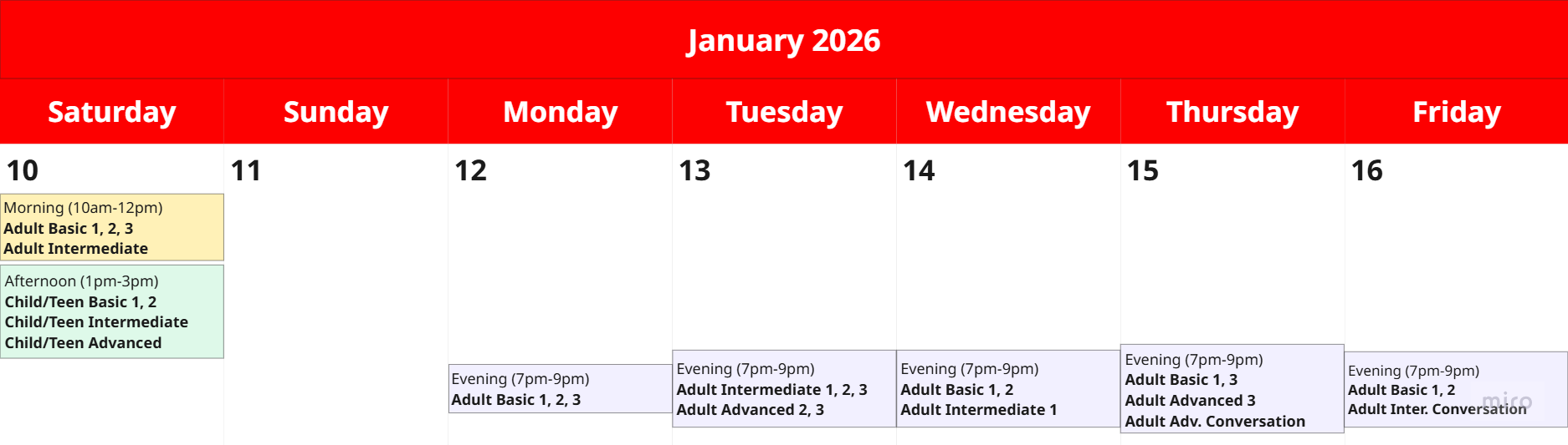 Classes offered: Basic 1, Basic 3, Advanced 3, Advanced Conversation